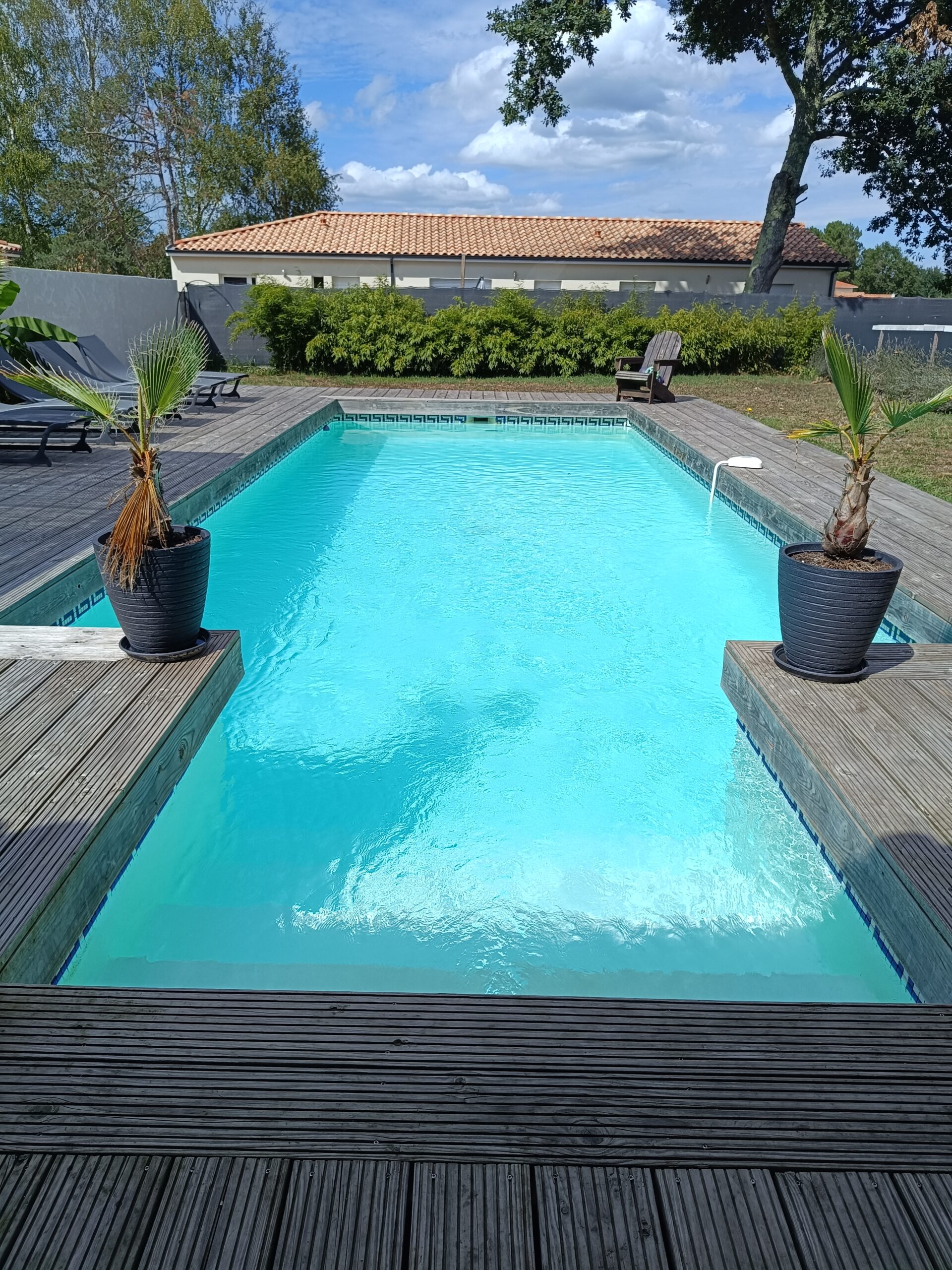 La piscine est chauffée du premier juillet au trente et un août, garantissant une température agréable pendant toute la période estivale. Elle est entourée d’une grande terrasse de plus de cent mètres carrés, idéale pour se détendre ou surveiller les enfants en toute sérénité.